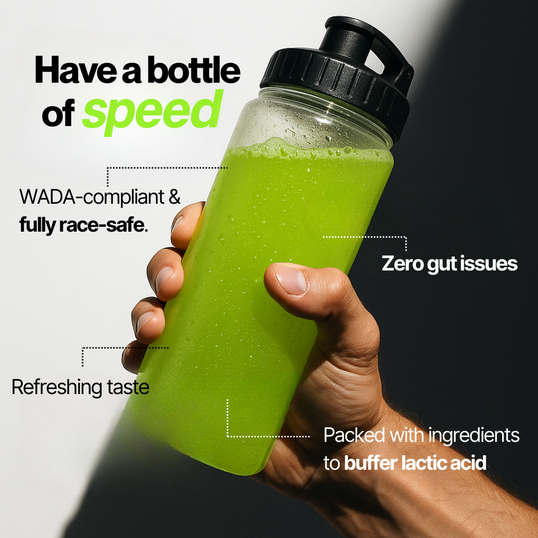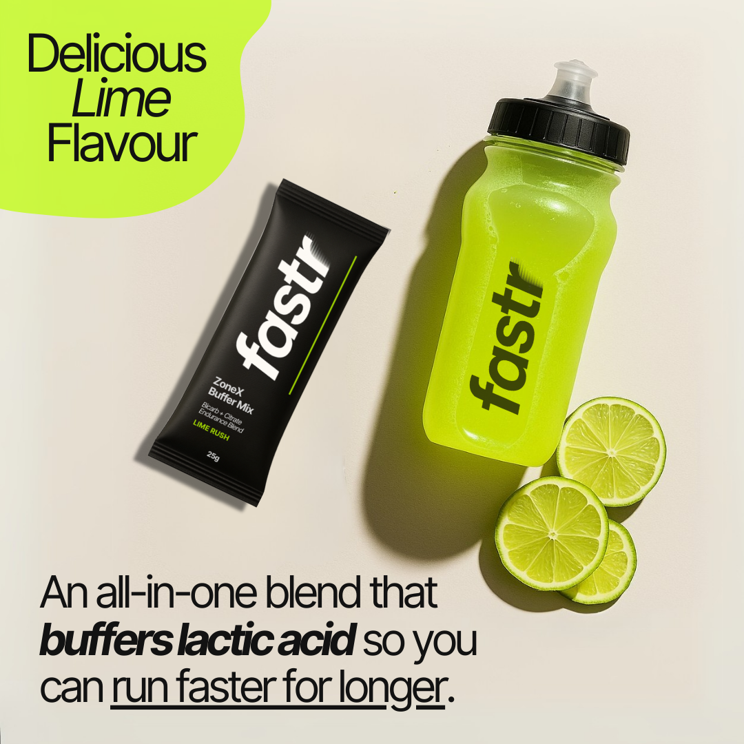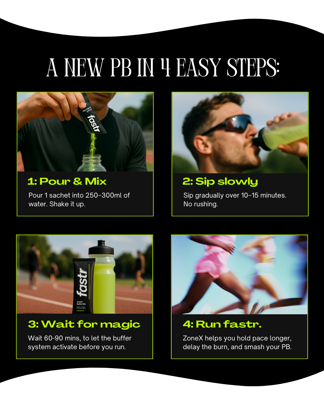 ZoneX is a pre-run drink mix formulated with a high-performance blend of sodium bicarbonate and citrate. It helps buffer the lactic acid buildup that causes your legs to burn and slow down — so you can hold pace longer and push harder, without the gut issues or bad taste of traditional bicarb products.